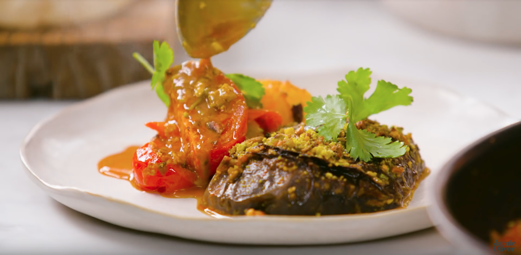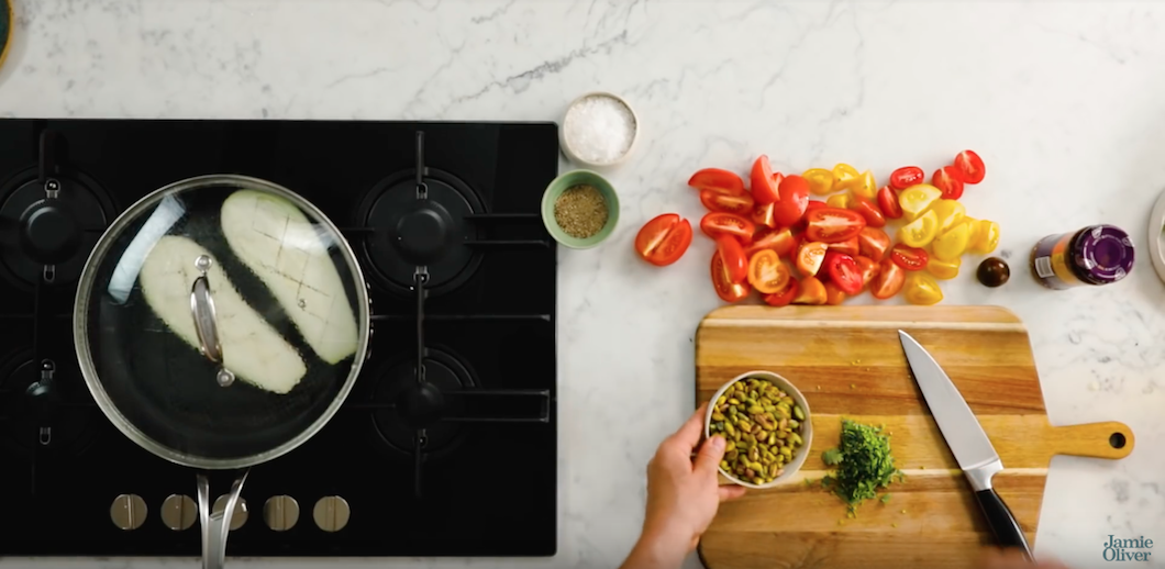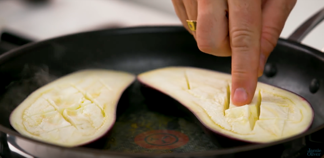 Jamie laat de aubergine dus eerst stomen. Hij snijdt een aubergine over de lengte door de helft, en zet er met een mes strepen in zodat de aubergine het vocht goed opneemt. Deze aubergines laat hij stomen in een koekenpan met een laag water totdat het water is verdampt. Daarna gaan de kruiden en tomaten erbij.