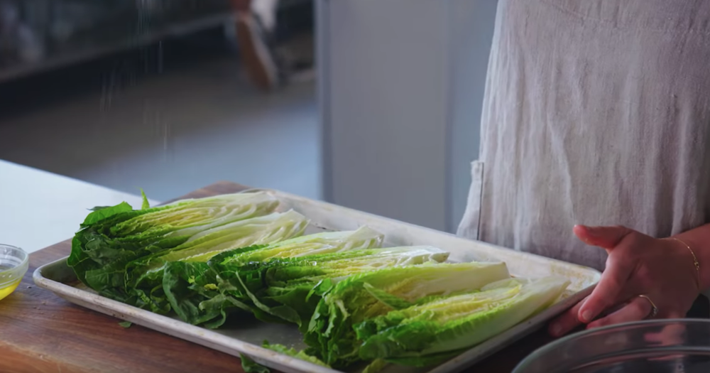 Voor de sla gebruikt Molly Romaine sla. Deze snijdt ze in de lengte door de helft, zodat de parten niet uit elkaar vallen. Die gaan even op de gril. Het is niet de bedoeling om de sla te koken, maar wel dat ‘ie een fijne grill-smaak krijgt.