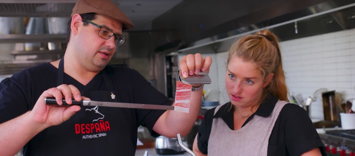 Bon Appétit-redacteur Molly Baz krijgt een hele Spaanse hampoot – Jamon Ibérico de Bellota nog wel – tot haar beschikking. Deze hamsoort kost algauw € 175,- euro per 450 gram. Een luxe hammetje dus! De varkens waar deze hammen vandaan komen, krijgen een dieet van alleen maar eikeltjes. Die zorgen voor de karakteristieke smaak van de ham.