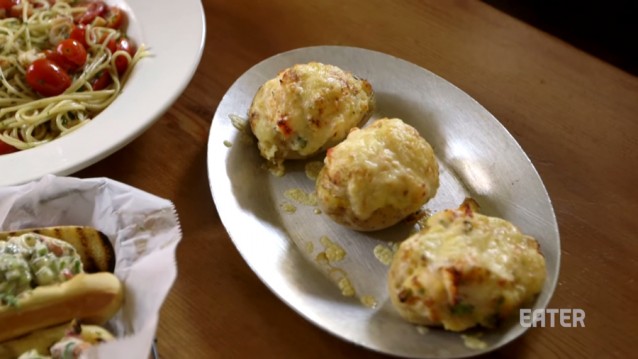 Lobster rolls, een twice baked aardappel met een zure room, kaas en kreeftvulling en een snelle pasta met kreeftensaus en tomaatjes.