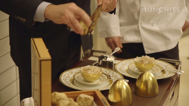 Door naar restaurant Per Se. Chefkok Eli Kaimeh maakt roerei met Castelmagno kaas en geschaafde witte truffel. Uiteraard geserveerd op een gouden bordje.