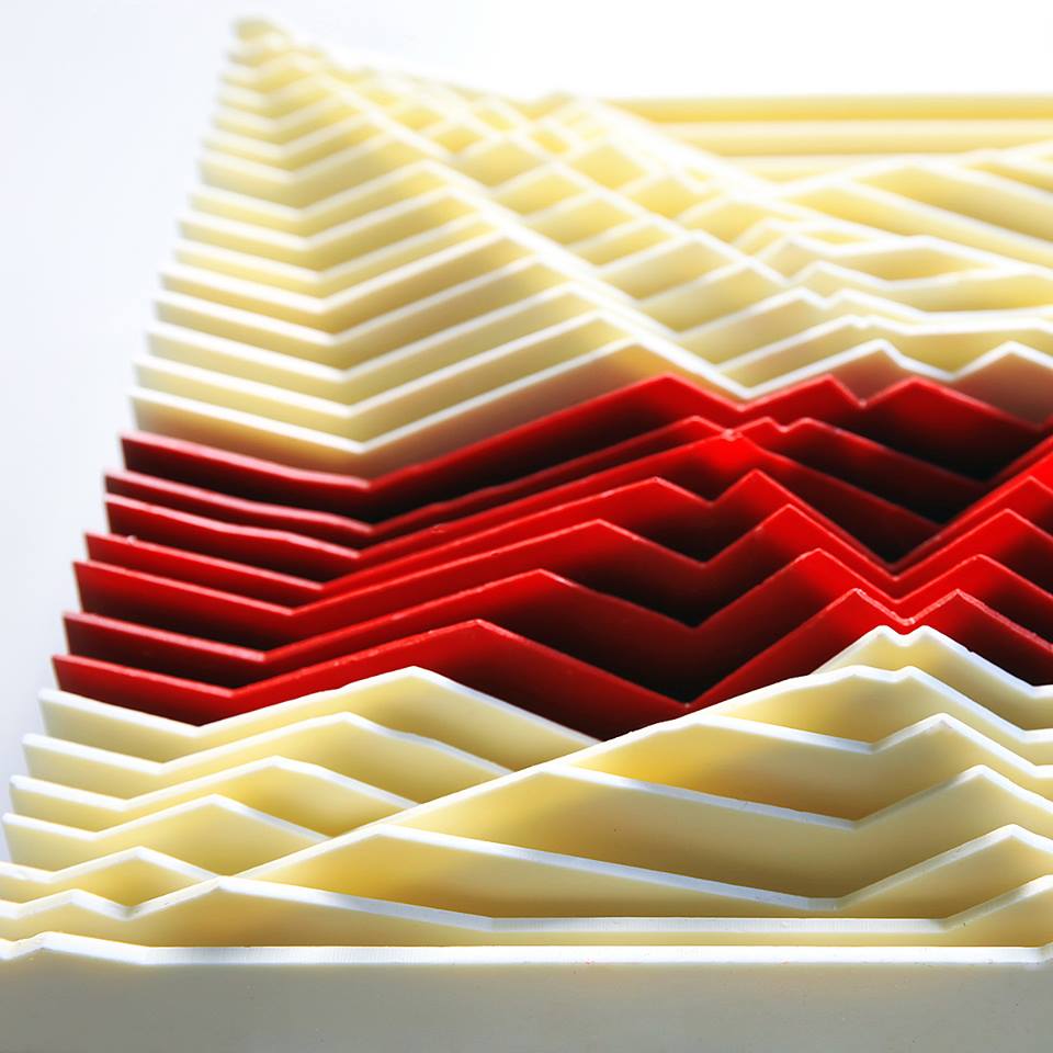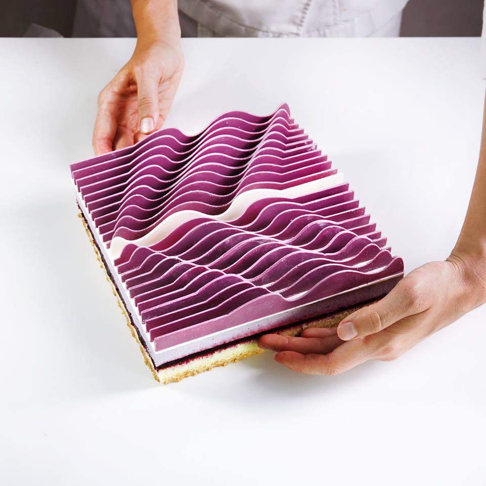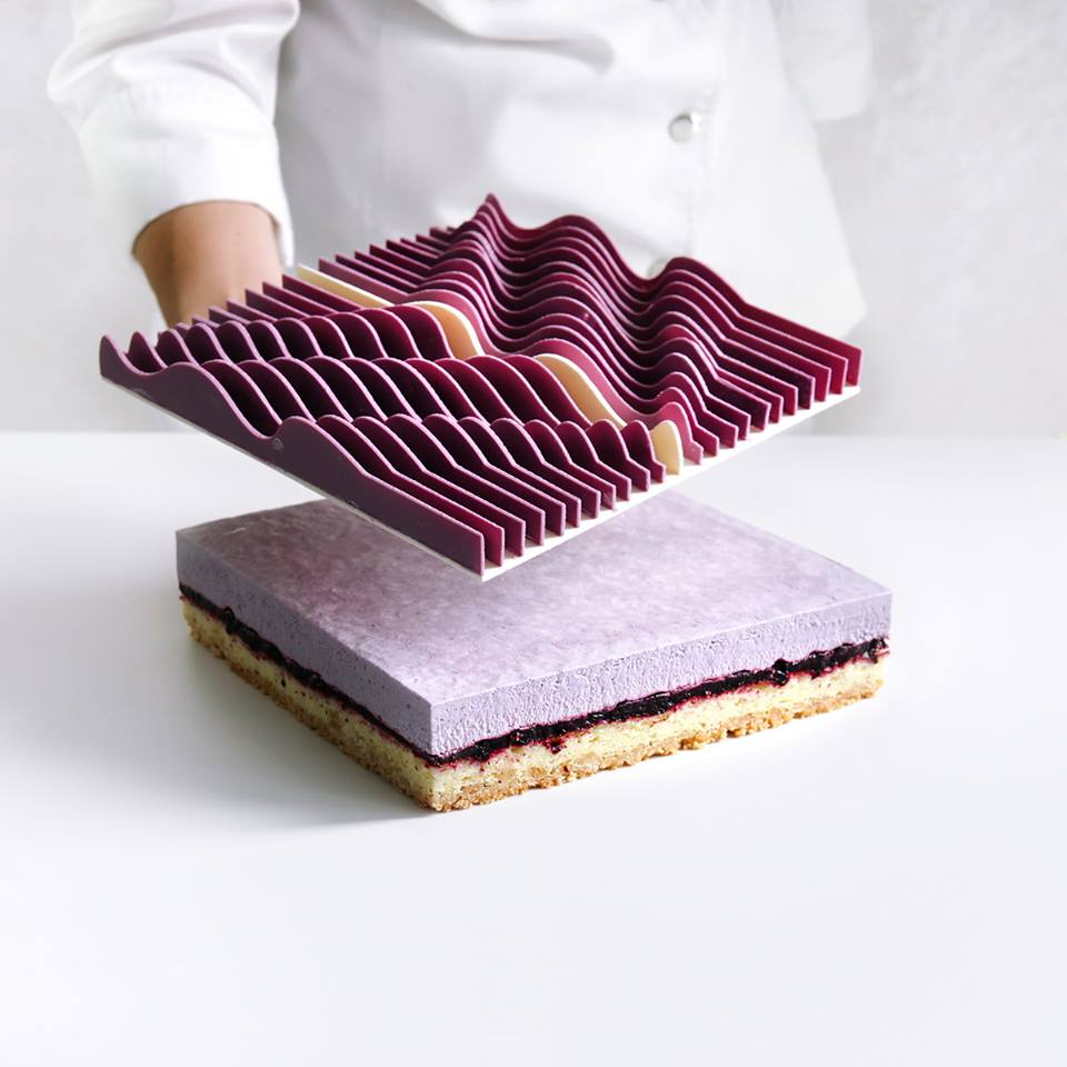 Met geometrische abstractie en kinetische kunst maakte de kunstenaar eerst patronen in lagen plastic. De chef gebruikte die patronen daarna om verschillende lagen te snijden uit chocolade. Ze rangschikte ze op de taarten, en creëerde zo een interessant gelaagd effect met kleuren en vormen.
