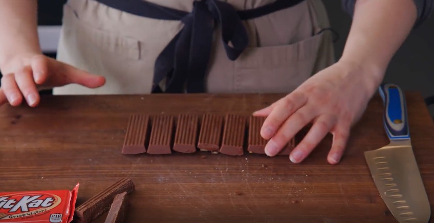 Daarna moeten de wafeltjes worden gestapeld, met chocolade ertussen. Claire maakt een vulling van donkere chocolade voor tussen de laagjes wafel. Ze snijdt ze in reepjes, waarvan ze er vier tegen elkaar aan legt, om die kenmerkende KitKat-vorm te krijgen.