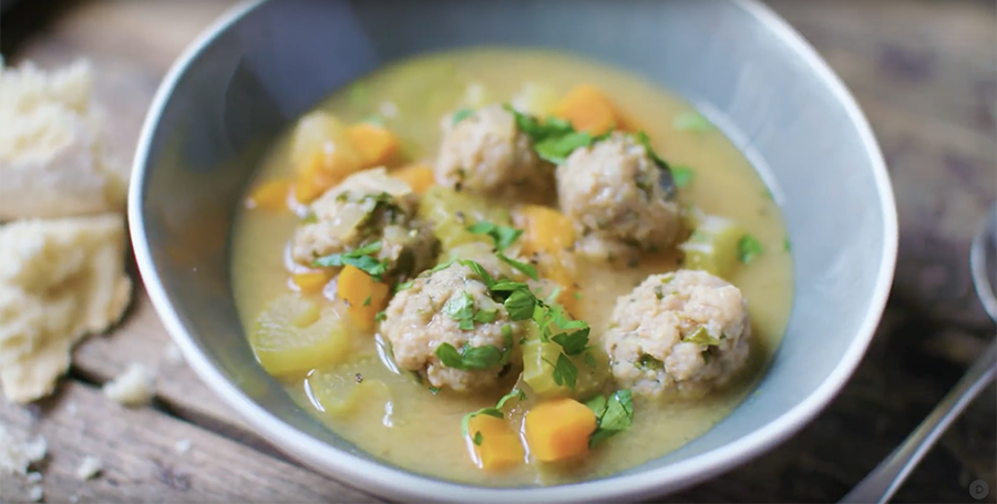 Ben je snotterig, grieperig of gewoon toe aan een grote kom comfort food? Donal Skehan komt als een soort culinaire Batman to the rescue met deze kippensoep met balletjes. Daar kikker je meteen van op.