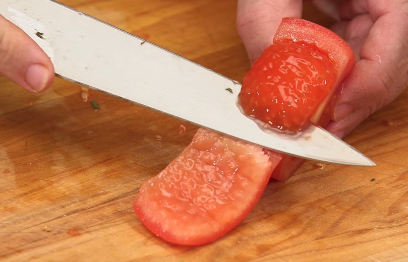 En nog een hele belangrijke: gooi nóóit de zaadjes van de tomaat weg. Ook de natuurlijke gelatine die om de zaadjes heen zit, vindt de chef een fantastisch ingrediënt.