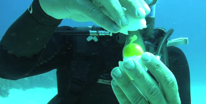 Wat gebeurt er als je een ei 20 meter onder water breekt? Nou, dit dus. Fascinerend!
